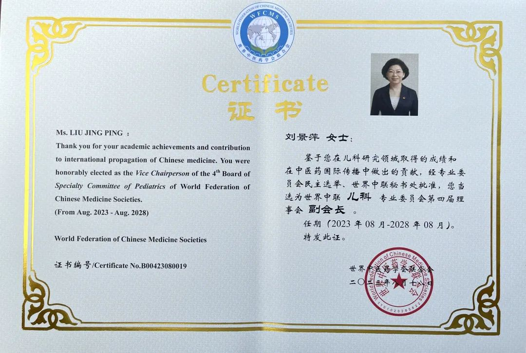 乐天使药业集团党委书记、董事长刘景萍当选世界中医药学会联合会儿科专业委员会第四届理事会副会长